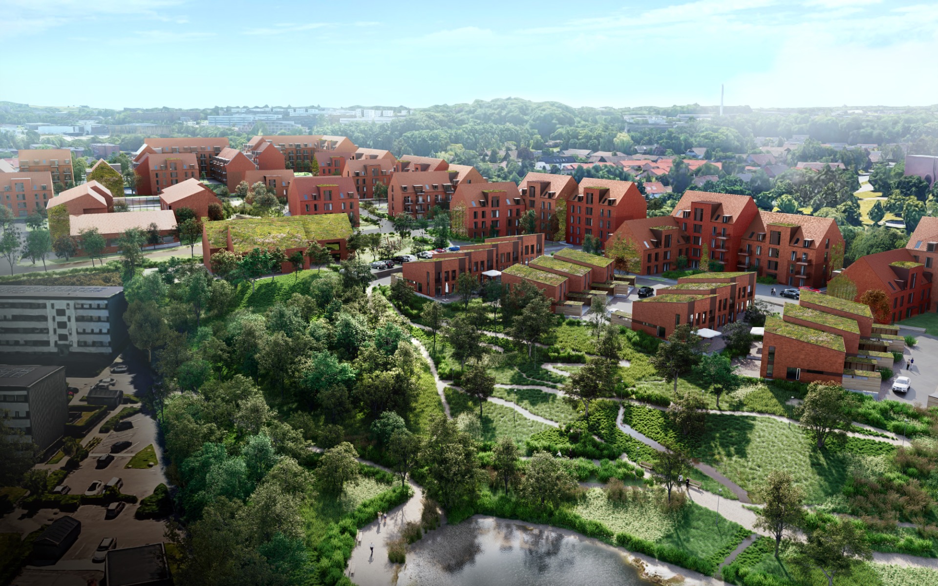 Bebyggelsen vil rumme en varieret sammensætning af lejligheder, rækkehuse, seniorboliger, erhverv og et friplejehjem – alt sammen integreret i en arkitektur, der skaber et harmonisk udtryk og tager hensyn til områdets eksisterende kvaliteter. Langs Skanderborgvej opføres etage- og erhvervsbyggeri, som både markerer en tydelig bymæssig grænse og samtidig skærmer det øvrige område mod støj. Mod nord placeres rækkehusene i direkte kontakt med naturen, i en skala og udformning der styrker det grønne naboskab og fællesskabet i området.